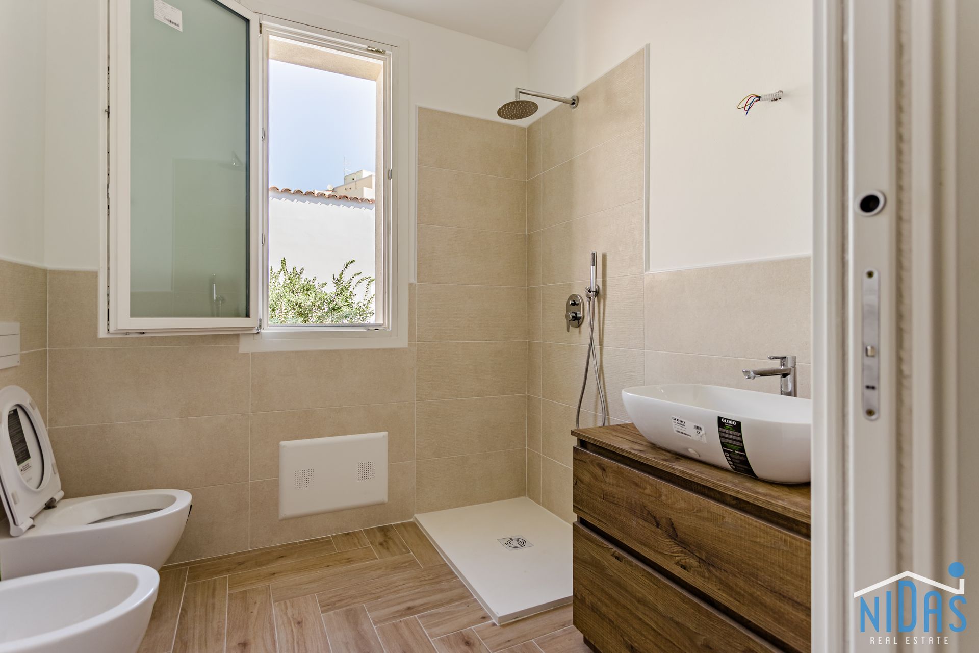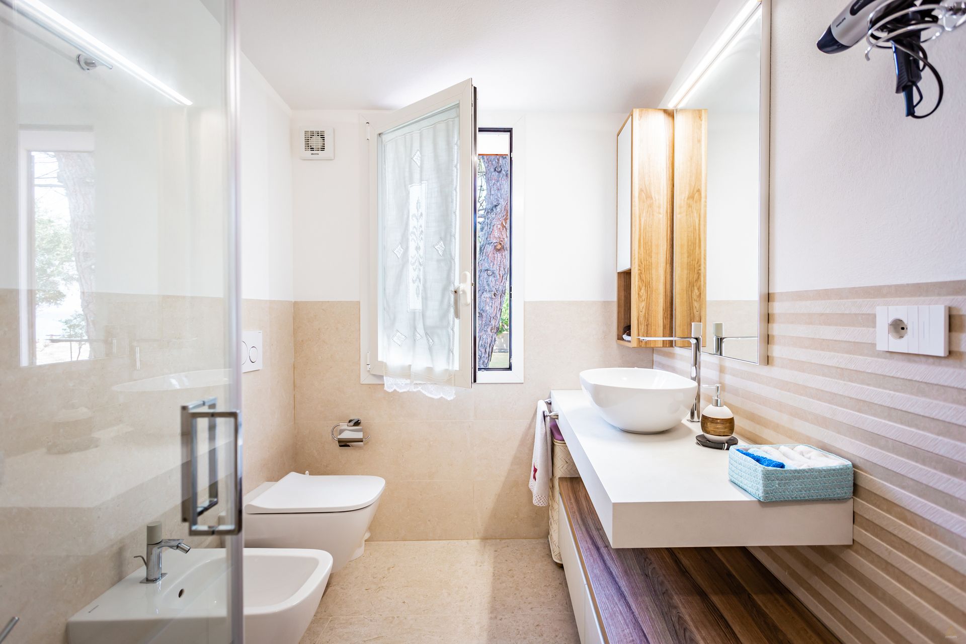 I due bagni, dotati di rifiniture di pregio, assicurano funzionalità e stile. Ogni angolo della casa è stato studiato per coniugare design e praticità, senza mai rinunciare al calore degli elementi naturali, come il tetto in legno bianco che caratterizza la villetta e aggiunge un tocco elegante e accogliente.